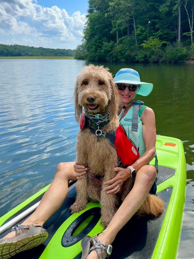 Wilson likes to paddle board. He only barked once–we saw and heard a tree fall. I think a bark was warranted.